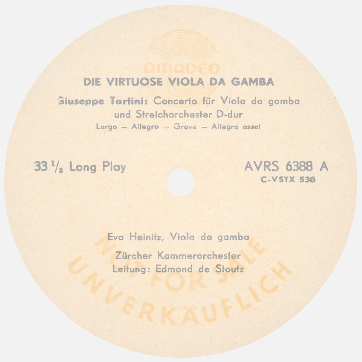 En 1965 (je n'ai pas encore pu trouver d'informations plus exactes sur date et lieu d'enregistrement), Edmond de STOUTZ enregistra deux oeuvres pour viole de gambe de Giuseppe TARTINI et de Georg Philipp TELEMANN avec son Orchestre de chambre de Zurich et Eva HEINITZ en soliste. Le tout fut publié sur ce disque Amadeo AVRS 6388: