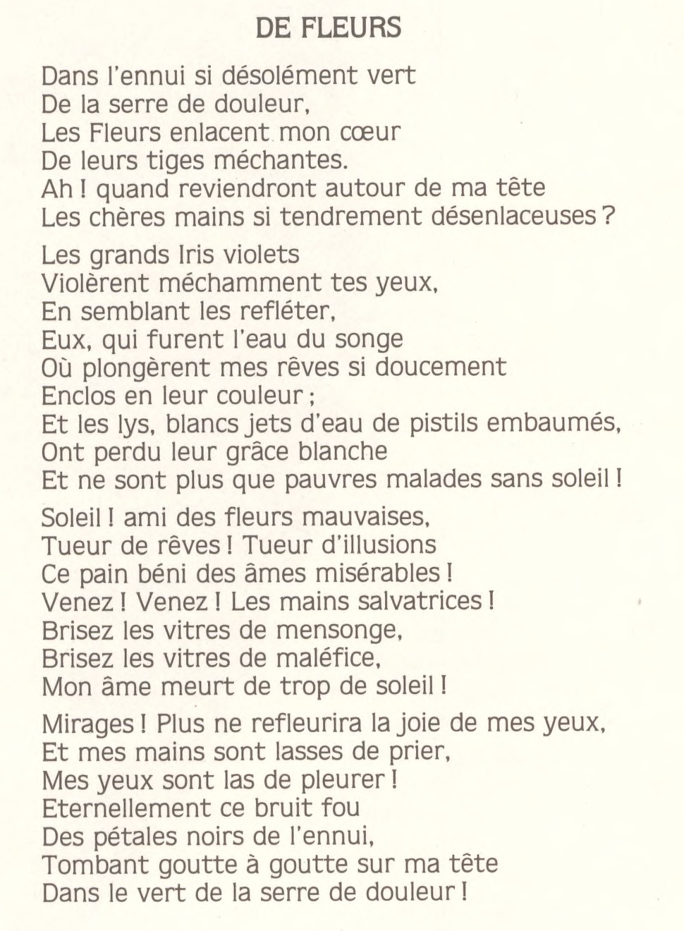 La troisième pièce, „De fleurs“, selon Louis Laloy, „à l'agitation d'un mauvais rêve; il semble faire allusion aux „Serres chaudes“, poème morbide de Maeterlinck, que Chausson a ensuite mis en musique; il est dédié à l'épouse du compositeur“. Le début de la partie piano, écrite entièrement en accords parfaits successifs, ressemble curieusement aux formes légèrement primitives de Satie, et la ligne vocale, inhabituellement émouvante et audacieuse, justifierait à elle seule sa dédicace à l'épouse de l'auteur de la dernière grande symphonie romantique.