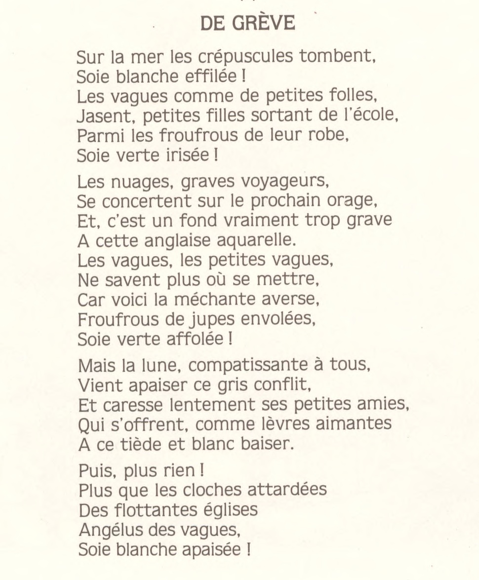 „De grève“, la seconde pièce, sans jamais évoquer clairement la mer, est étroitement lié, dans la partie piano, à des pièces ultérieures pour clavier inspirées par la contemplation ou le souvenir des étendues et des paysages marins. La ligne vocale est plus romantique, procédant plus volontiers par grands intervalles mélodiques.