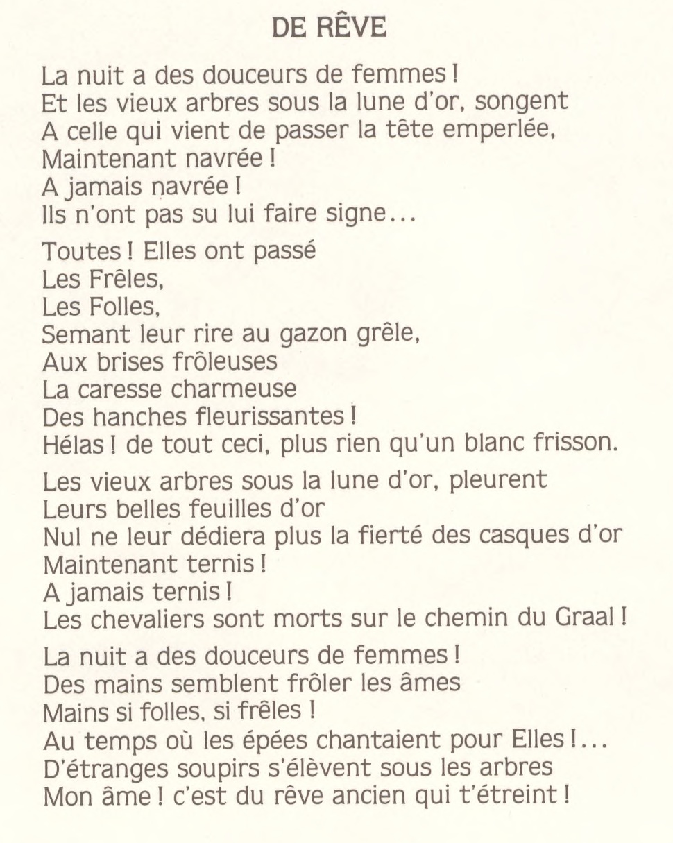 La première pièce, „De rêve“, est sans aucun doute dans l'esprit de certaines pages de Pelléas; même narration brumeuse, même lyrisme agité, mêmes images harmoniques du texte. Certains motifs mélodiques, confiés ici au piano, sont les précurseurs de certaines phrases instrumentales qui se détachent dans la partition du drame lyrique, tout comme certaines successions d'accords particulièrement caractéristiques se retrouvent ici et là avec la même valeur expressive.
