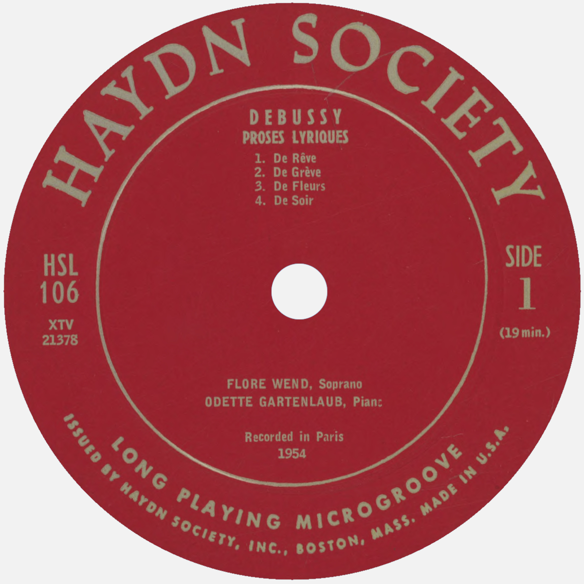 C’est le jeune éditeur français Michel BERNSTEIN, le futur créateur des labels Valois, Astrée ou bien plus tard Arcana, qui proposa à la soprano Flore WEND - alors installée à Paris - de se consacrer à quelques cycles de Claude DEBUSSY, en l’occurrence „Proses lyriques“, les „Chansons de Bilitis“ et les „Ballades de François Villon“. Bernstein publia ces sessions sur son premier label, „Vendôme“. Dans cette prise de son datant du 9 mars 1954, faite dans la Salle Aydar de Paris avec André CHARLIN comme ingénieur du son, publiée sur „Vendôme“ CM 9101, puis rééditée sur „The Haydn Society Boston“ HSL 106, Flore WEND est accompagnée au piano par Odette GARTENLAUB:
