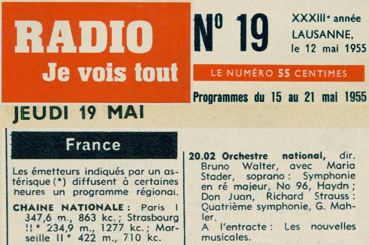 Le concert fut diffusé le 19 mai suivant sur la Chaîne Nationale française, ondes moyennes, 20h02 - 22h10: