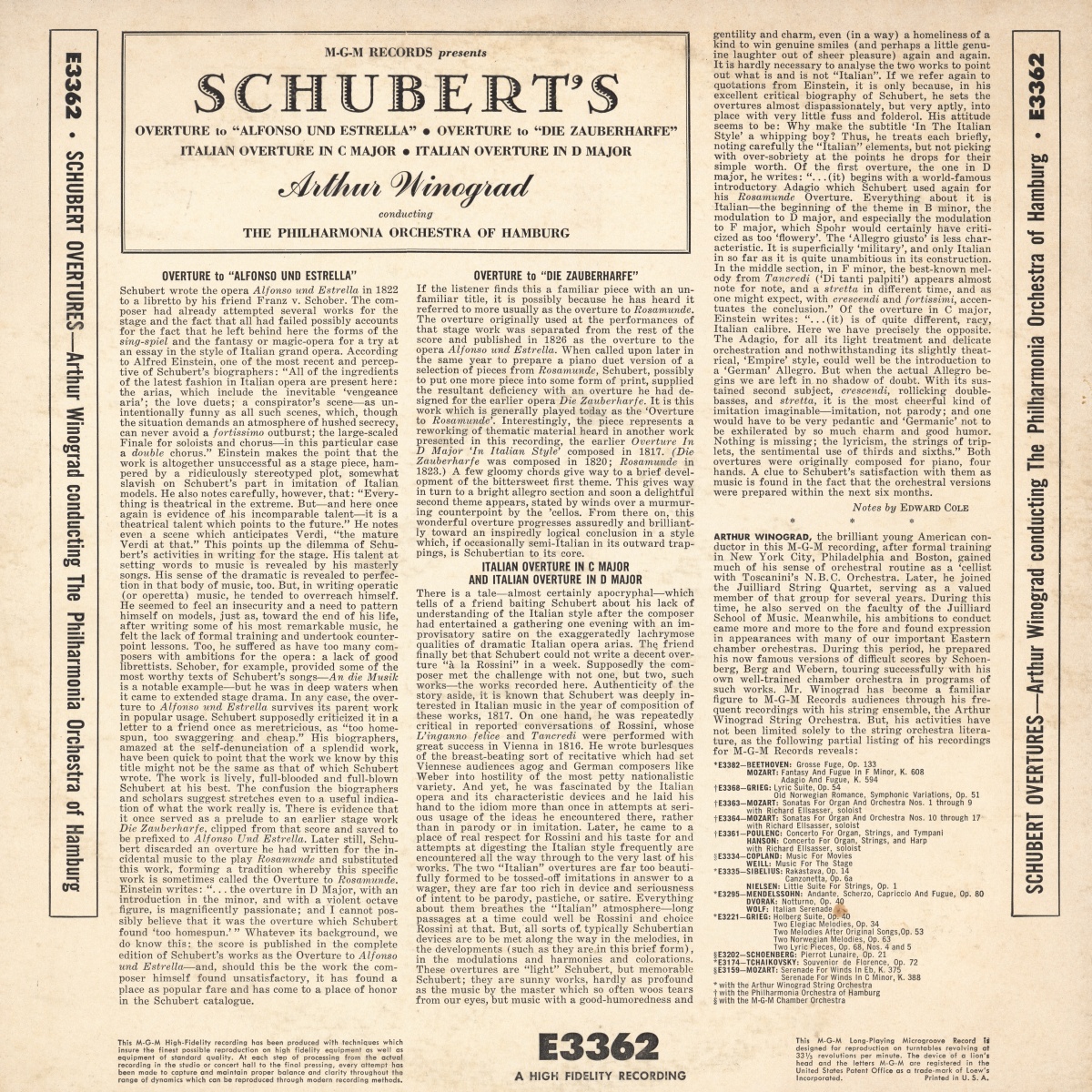 Dans les quatre ouvertures de Franz Schubert publiées sur ce 33 tours, Arthur WINOGRAD dirige «The Philharmonia Orchestra of Hamburg». Voir cette page de mon site pour quelques précisions sur cet orchestre.