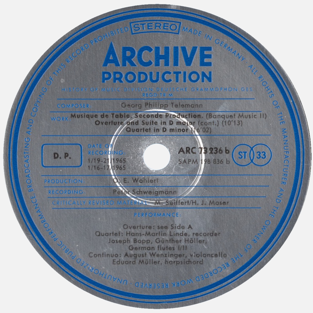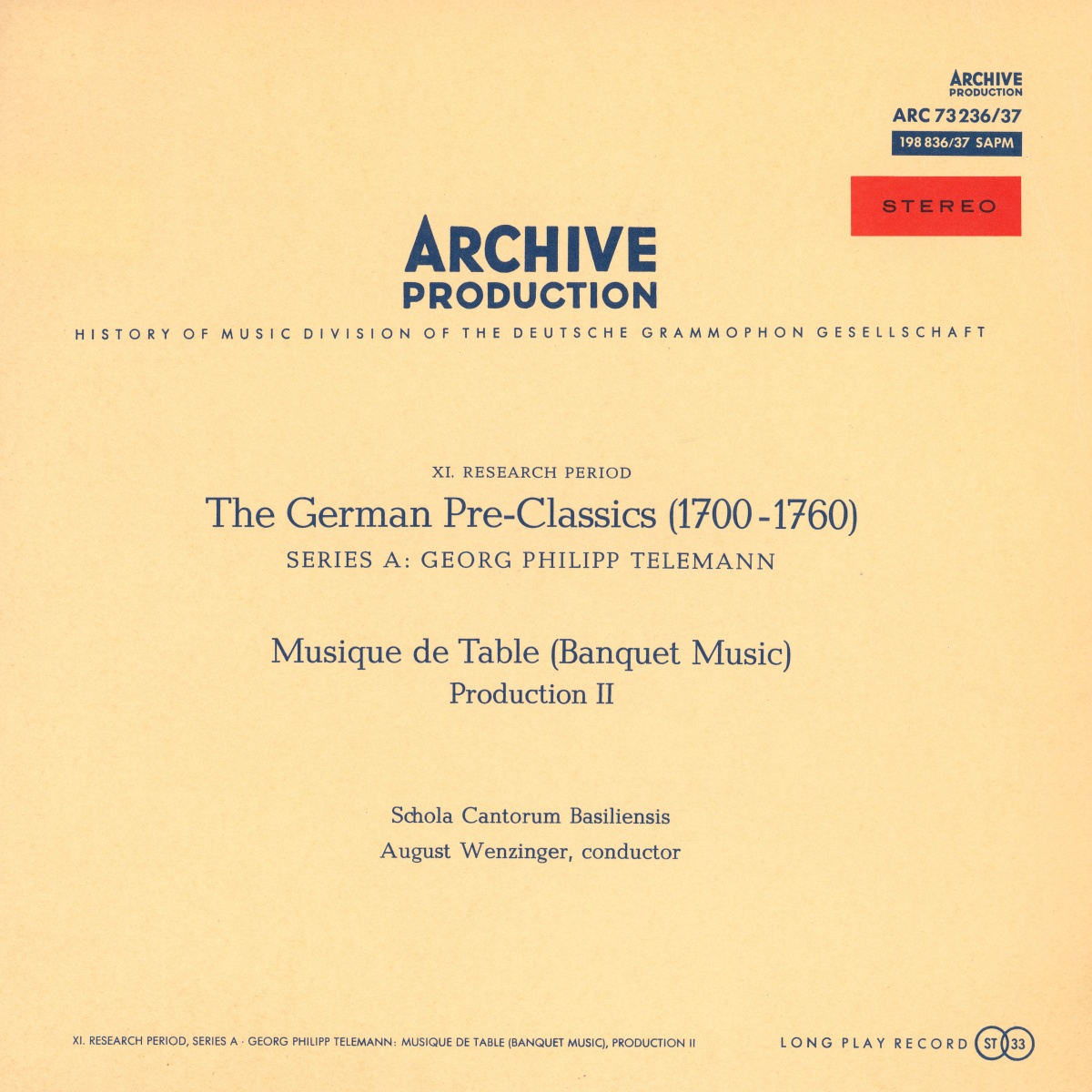 Du 14 au 23 janvier 1965, dans la salle de concert de l'Église Neumünster de Zürich, furent enregistrées les diverses parties de la «Tafelmusik Produktion II», par les membres de de la Schola Cantorium Basiliensis sous la direction de August WENZINGER: pour une courte présentation des interprètes et de leurs instruments, voir cette page de mon site.