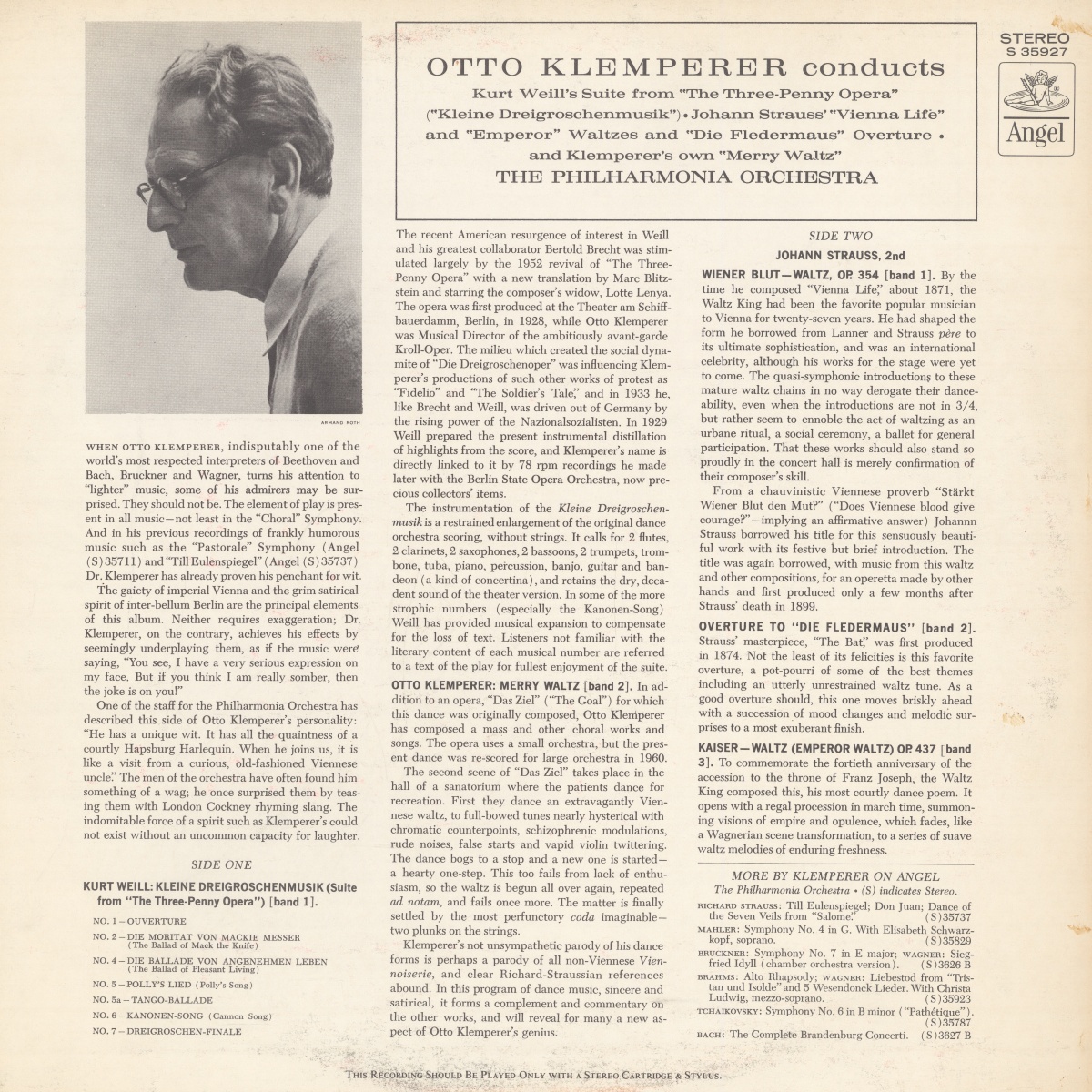 En 1952, le regain d'intérêt des Américains pour Kurt Weill et Bertold Brecht fut largement stimulé par la reprise de «Die Dreigroschenoper» - littéralement „L'opéra de trois sous“, mais en général nommé „L'Opéra de quat'sous“ - dans une nouvelle traduction de Marc Blitzstein et avec la veuve du compositeur, Lotte Lenya, dans le rôle principal. L'opéra avait été créé au «Theater am Schiffbauerdamm», à Berlin, en 1928, alors qu'Otto Klemperer était directeur musical de l'ambitieuse compagnie avant-gardiste «Kroll-Oper». Le milieu qui créa la „dynamite sociale“ de «Die Dreigroschenoper» influença les représentations de Klemperer dans d'autres oeuvres de contestation telles que „Fidelio“ et „L'histoire du soldat“. En 1929, Weill réalisa une suite instrumentale des moments forts de la partition: le nom d'Otto Klemperer y est directement lié par les enregistrements 78 tours qu'il réalisa un peu plus tard avec l'Orchestre de l'Opéra d'État de Berlin. Mais peu après, en 1933, il fut chassé d'Allemagne par le pouvoir croissant du nazisme, comme Brecht et Weill.