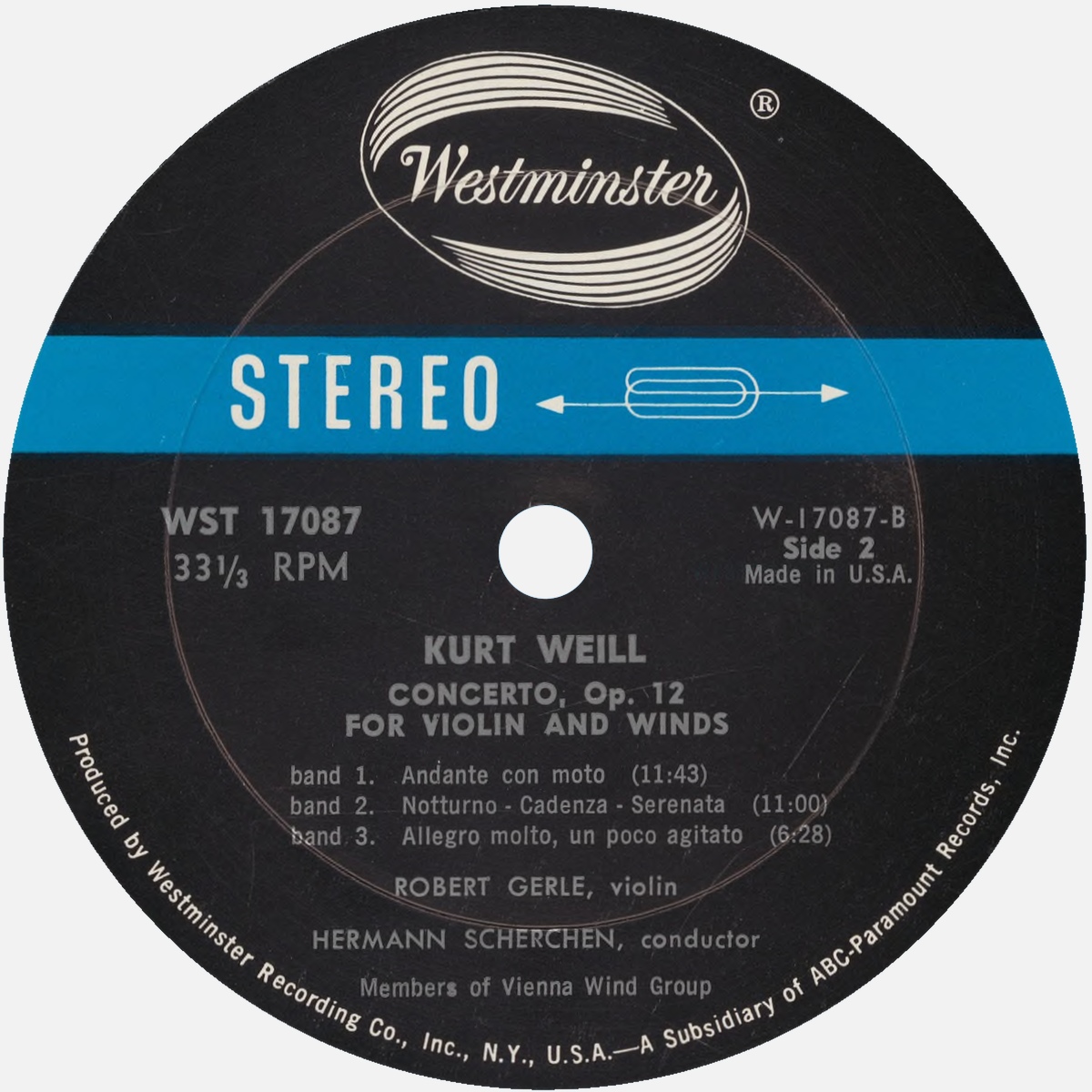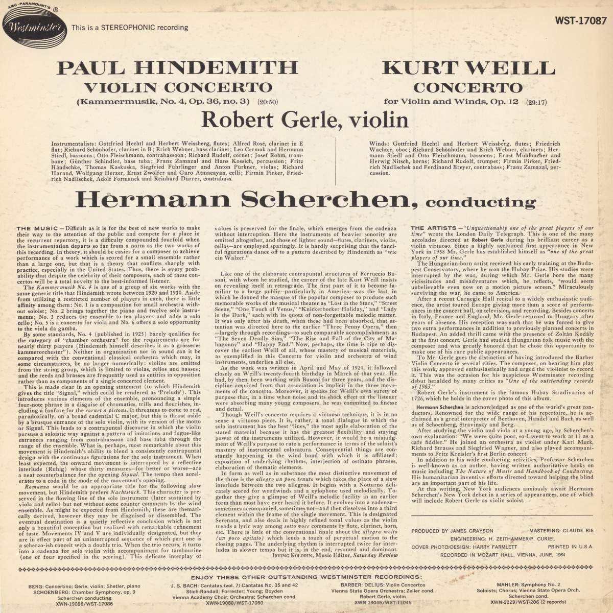 Kurt Weill, Concerto pour violon et Ensemble d'instruments à vent, cordes et percussion, op. 12, Robert GERLE, Ensemble d'instruments à vent, cordes et percussion, Hermann SCHERCHEN, 24 au 27 juin 1964, Salle Mozart du Konzerthaus de Vienne